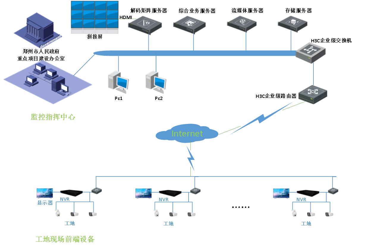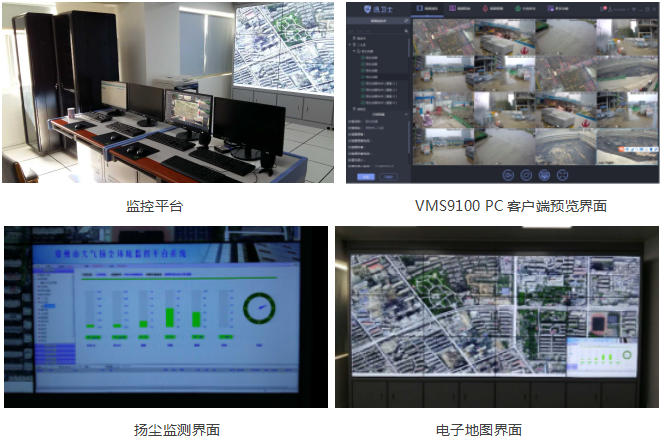 VMS9100平台+PM10扬尘监测平台(PM10监测设备)+1台综合管理服务器+3台流媒体+1台存储+1台12路解码+1000多台IPC+300多台8路NVR;