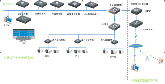 (2)项目解决方案:VMS9100平台+1台综合管理服务器+1台流媒体+1台12路解码+3台存储+300多台IPC;