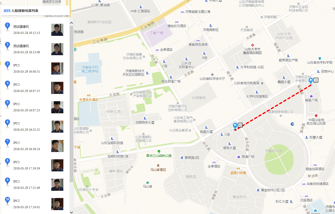 根据已知的人脸图片,在所有相机抓拍记录中,根据设定的搜索条件,快速找出该人员,并在地图上显示相应的运动轨迹。